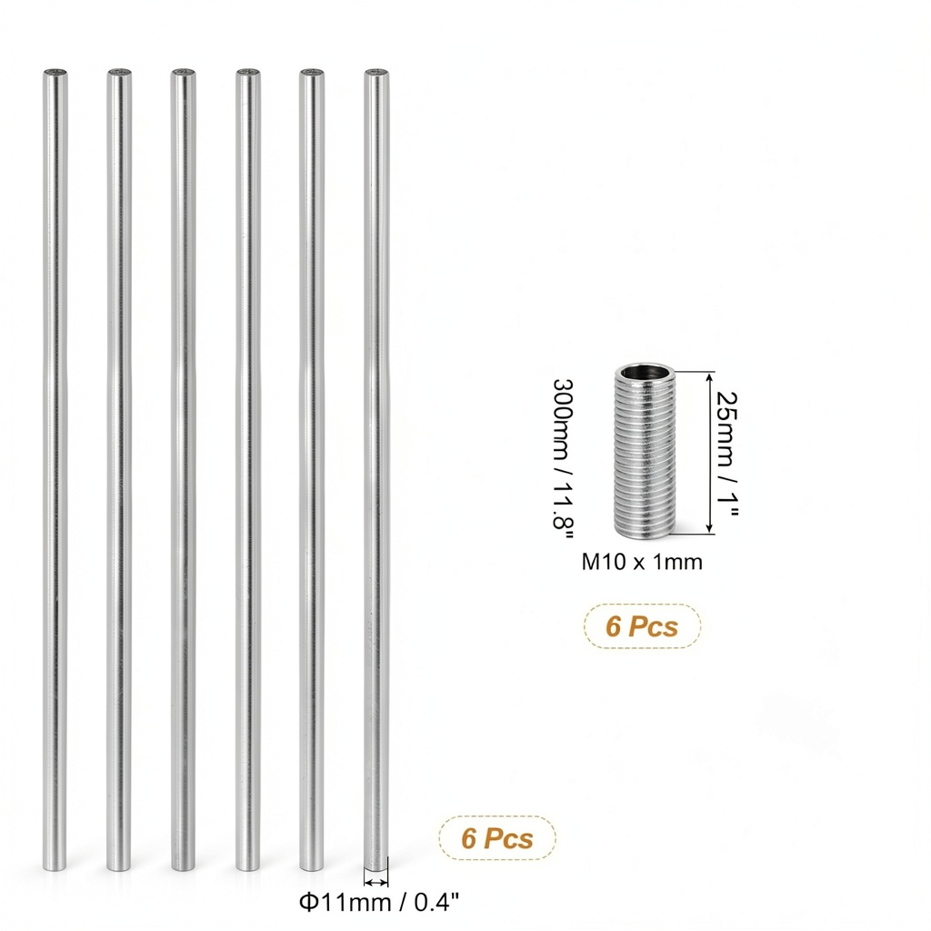 PATIKIL lamp extension rods and pipe nipples are essential accessories for modifying and repairing lighting fixtures. Crafted from robust metal in a sleek silver tone finish, these components feature M10 x 1mm fine threads that ensure compatibility with most standard lamps. Each rod measures 300mm in length with an 11mm outer diameter, while the pipe nipples are 25mm long, providing flexibility for various installation needs. The set includes six extension rods, making it suitable for multiple projects or replacements. Designed for durability and strength, these rods support significant weight without bending or deformation, ensuring long-term reliability in residential or commercial lighting setups.